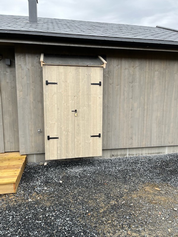 Skibod hektes på vegg, oppunder rammeplank ved evnt stavlaft utsmykning.Boden er på 0,4m2 og har Labankdør.